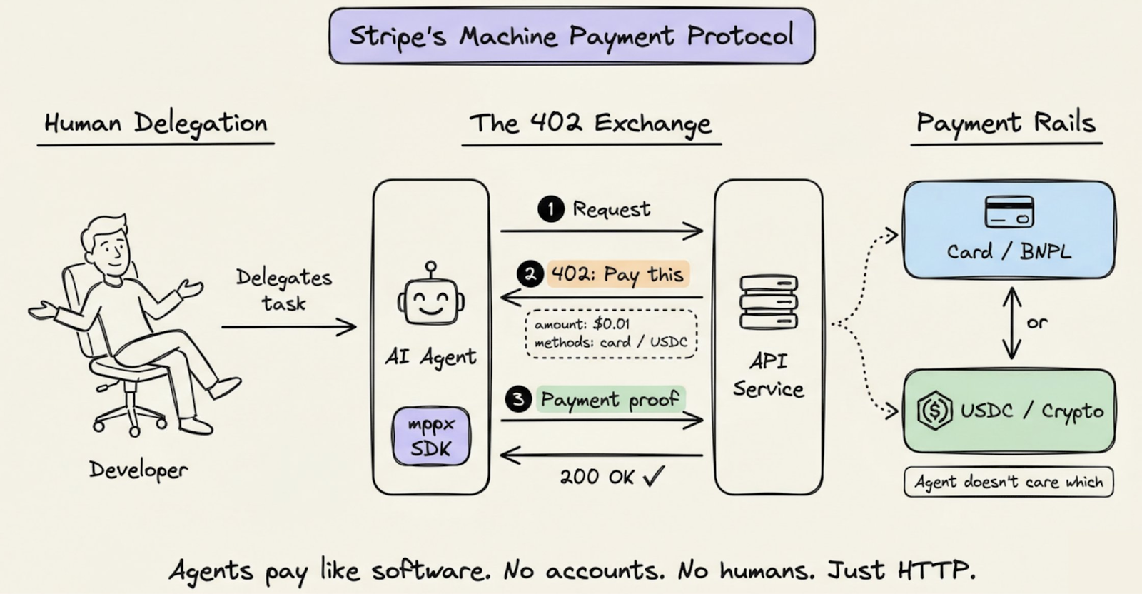Em 18 de março, a Stripe e a Paradigm lançaram o Machine Payments Protocol (MPP). Ele parte do mesmo diagnóstico que produziu o MCP. O problema de pagamentos para agentes não é que não existam sistemas de pagamento. É que cada sistema de pagamento é um universo separado, com sua própria lógica de autenticação, seus próprios formatos de requisição, suas próprias regras de autorização.